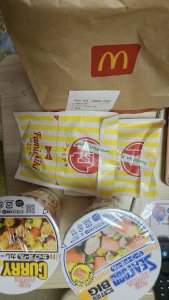 ナゲット15ピース、アップルパイ(本当はチョコパイ食べたかったけどなかった🥲︎)、カップヌードルBIC、ファミチキ、ファミチキレッド食べたよ👍🏻 ̖́-︎🐔